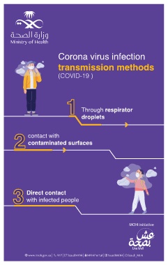 Corona virus infection transmission methods (COVID-19 ) Through respirator droplets contact with contaminated surfaces Direct contact with infected people MOH initiative Live Well www.moh.gov.sa 937 SaudiMOH MOHPortal SaudiMOH Saudi_Moh