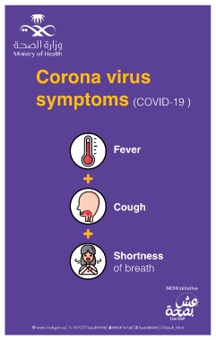 Corona virus symptoms (COVID-19 ) Fever Cough Shortness of breath MOH initiative Live Well www.moh.gov.sa 937 SaudiMOH MOHPortal SaudiMOH Saudi_Moh